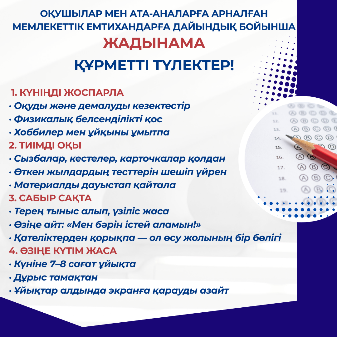 Ата-аналар мен түлектер назарына! Мемлекеттік емтихандарға дайындық бойынша жадынама